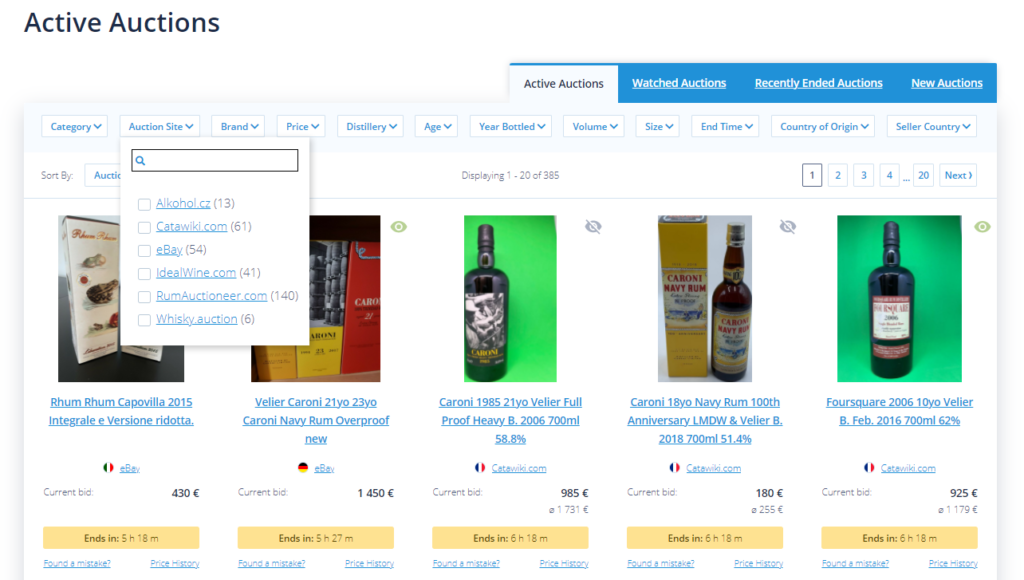 Look through many auction listings with our Auction Explorer to find rare and popular bottles. Keep track of ongoing auctions and get alerted before they end, so you never miss out.
